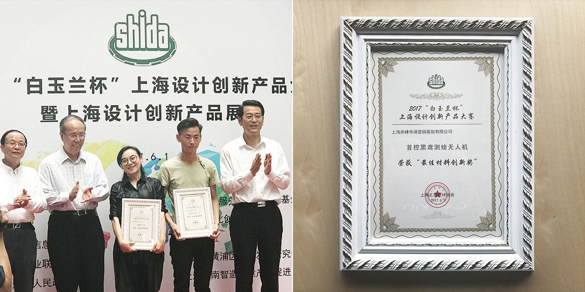 岸峰團隊設(shè)計作品--首控黑鳶測繪無人機,一舉拿下2017“白玉蘭杯”上海設(shè)計創(chuàng)新產(chǎn)品大賽“最佳材料創(chuàng)新獎”